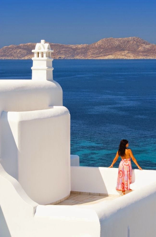 Of all the unique architectural features that distinguish St. John Mykonos Hotel, the stunning five-star luxury resort on Mykonos, none is more iconic than the graceful, chalk-white bridge that begins at poolside and takes you into the Aegean Sea. Through the morning mist, I could see the figure of a slim young woman in white standing on the crescent-shaped overpass. Like Aphrodite, she seemed to be rising from the foam of the sea. She was framed against the rosy-fingered dawn, rising in slender waves of orange and purple ribbons, tossed across the sky.